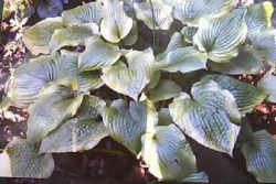 Feuillage bleu, texture gaufree, forme une coupe. Fleurs blanches.