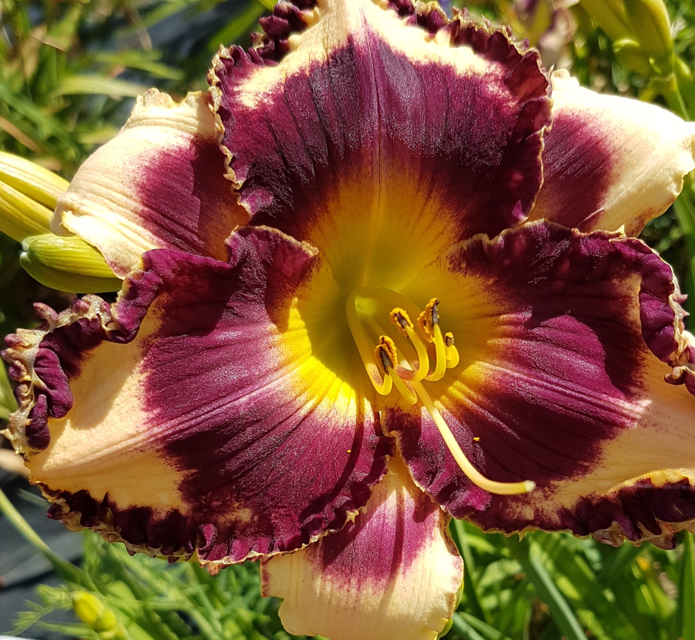 Fleur bourgogne violacee avec un coeur et une large bordure frisee et dentelee or. Odorante, tres abondante floraison (Big Red Wagon x Dark Night Dynamite)