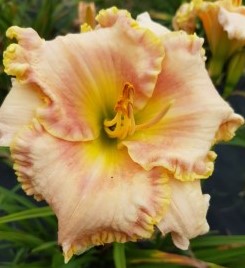 Grande fleur creme rose avec un coeur et une bordure jaune canari. Plant remarquable, longue floraison, odorante.